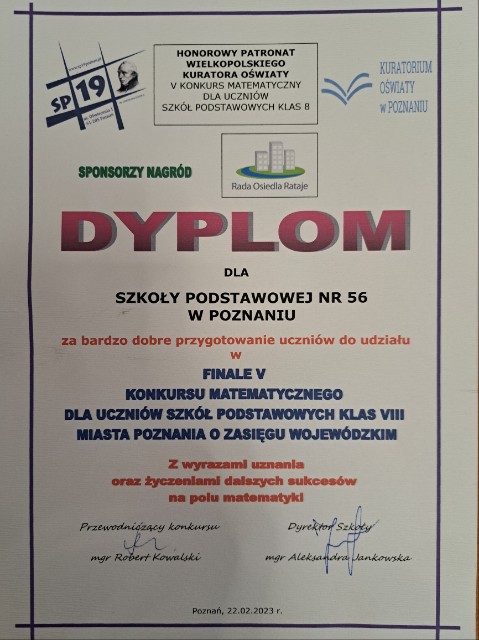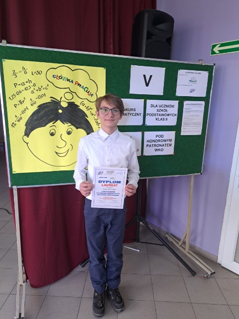Gratulacje dla Tomasza Wyszkowskiego z 8c SP, za sukces w V Konkursie Matematycznym dla uczniów Szkół Podstawowych klas VIII Miasta Poznania.