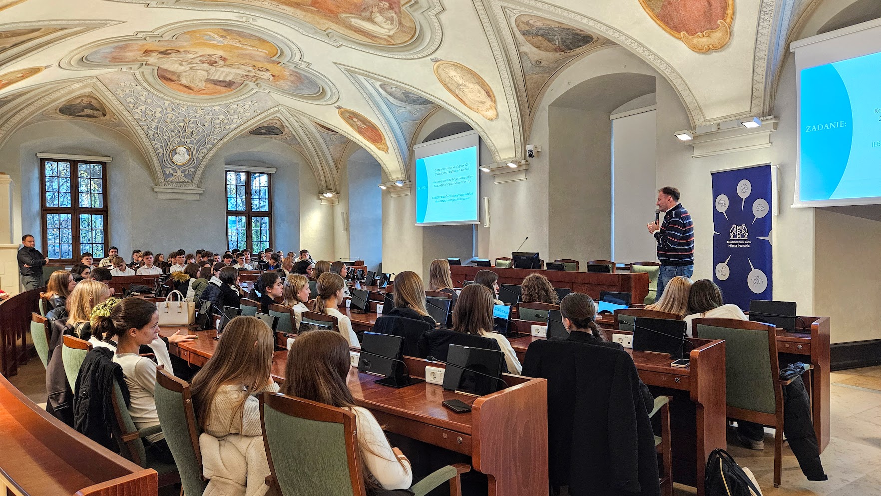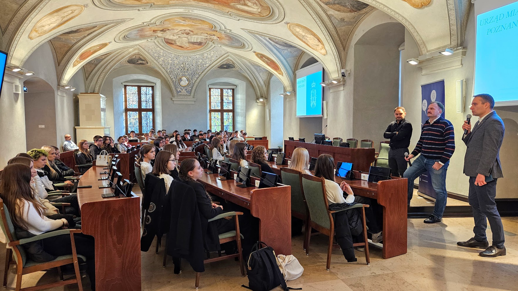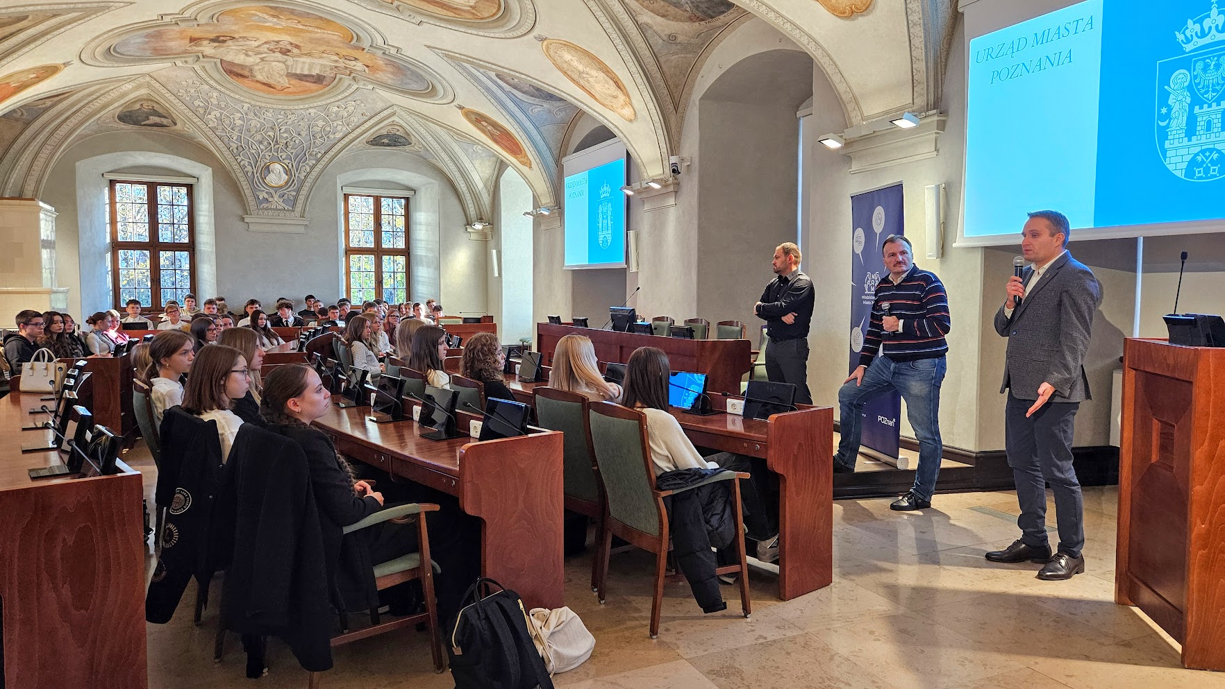 6 listopada w pięknej Sali Sesyjnej im. Wojciecha Szczęsnego Kaczmarka w Urzędzie Miasta Poznania odbyło się wyjątkowe spotkanie uczniów klas drugich i czwartych z Radnymi Miasta – Tomaszem Stachowiakiem oraz Przemysławem Plewińskim. Swoją obecnością zaszczycił nas również Zastępca Prezydenta Miasta Mariusz Wiśniewski.