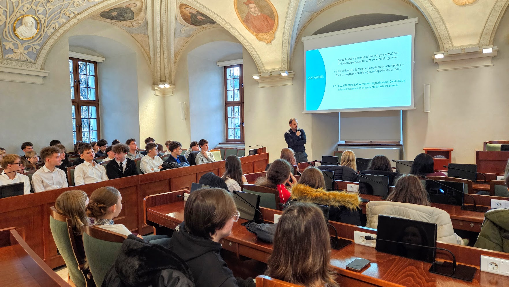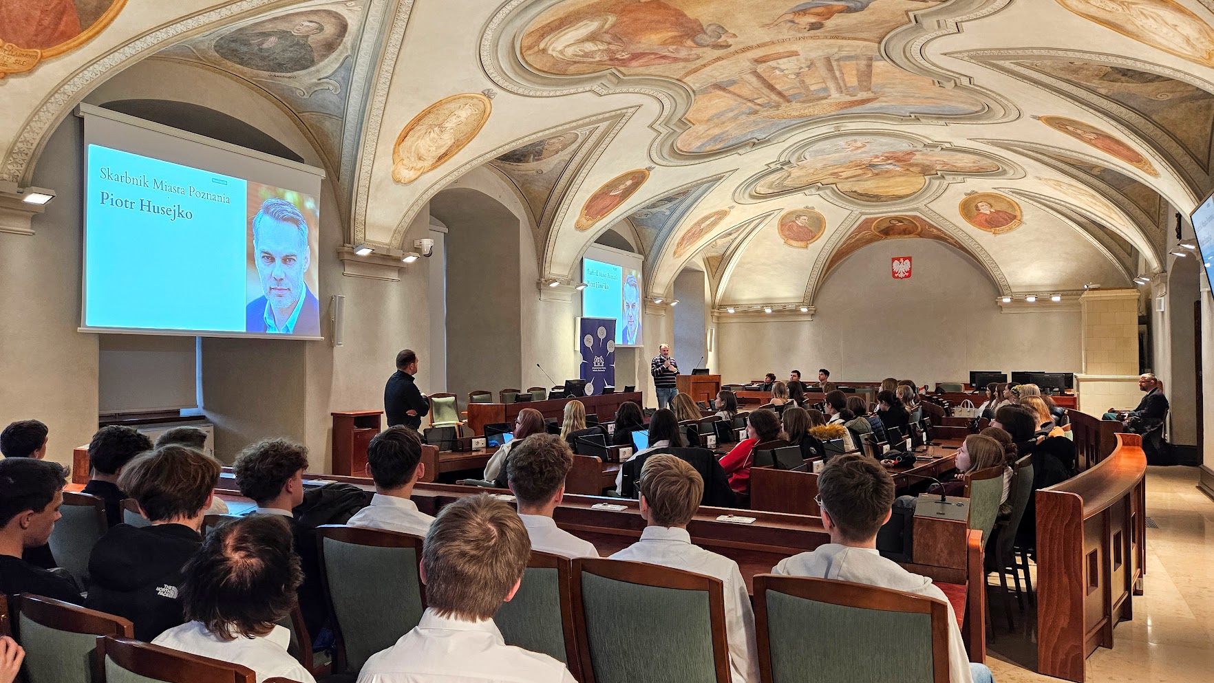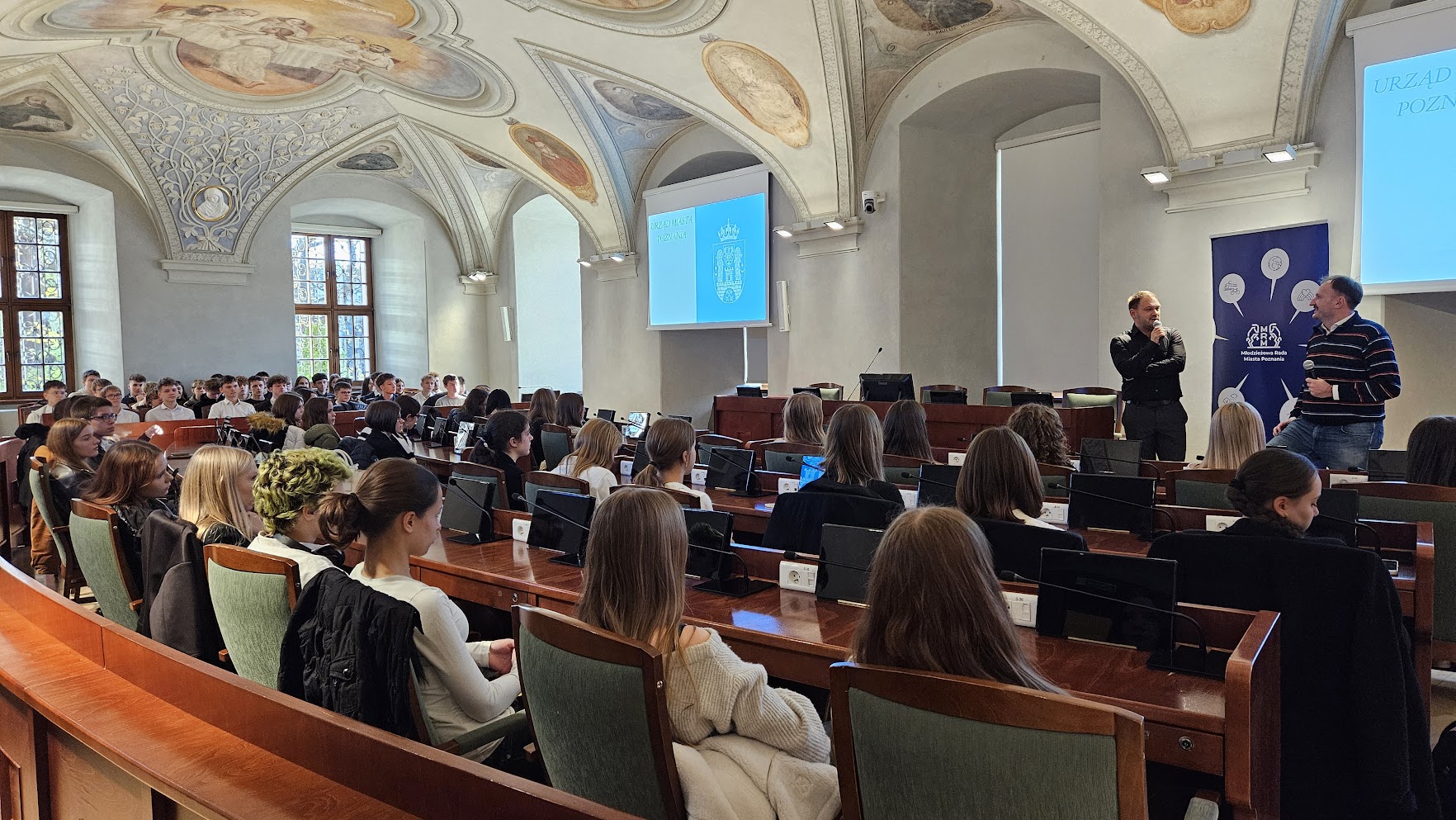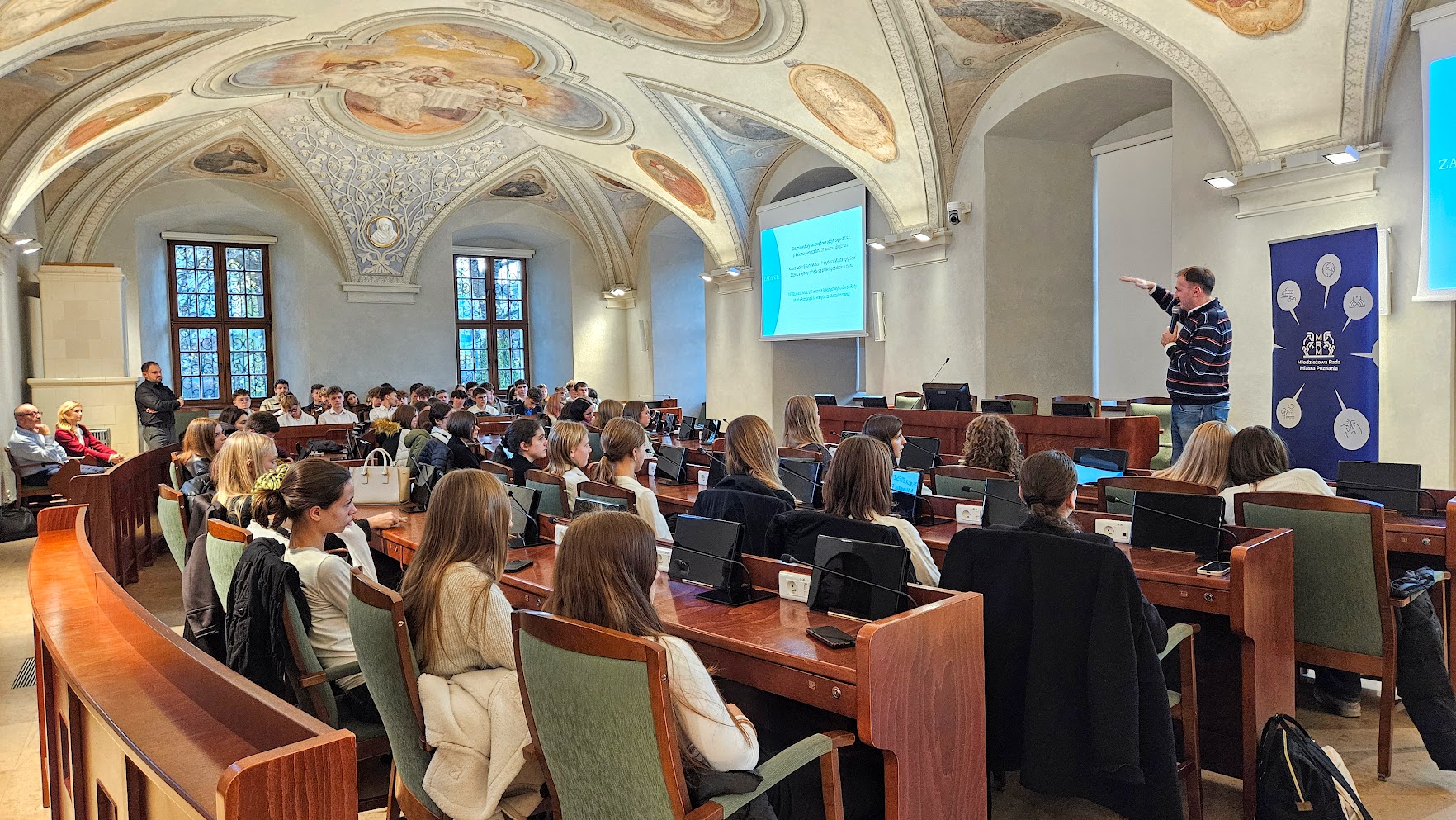 6 listopada w pięknej Sali Sesyjnej im. Wojciecha Szczęsnego Kaczmarka w Urzędzie Miasta Poznania odbyło się wyjątkowe spotkanie uczniów klas drugich i czwartych z Radnymi Miasta – Tomaszem Stachowiakiem oraz Przemysławem Plewińskim. Swoją obecnością zaszczycił nas również Zastępca Prezydenta Miasta Mariusz Wiśniewski.