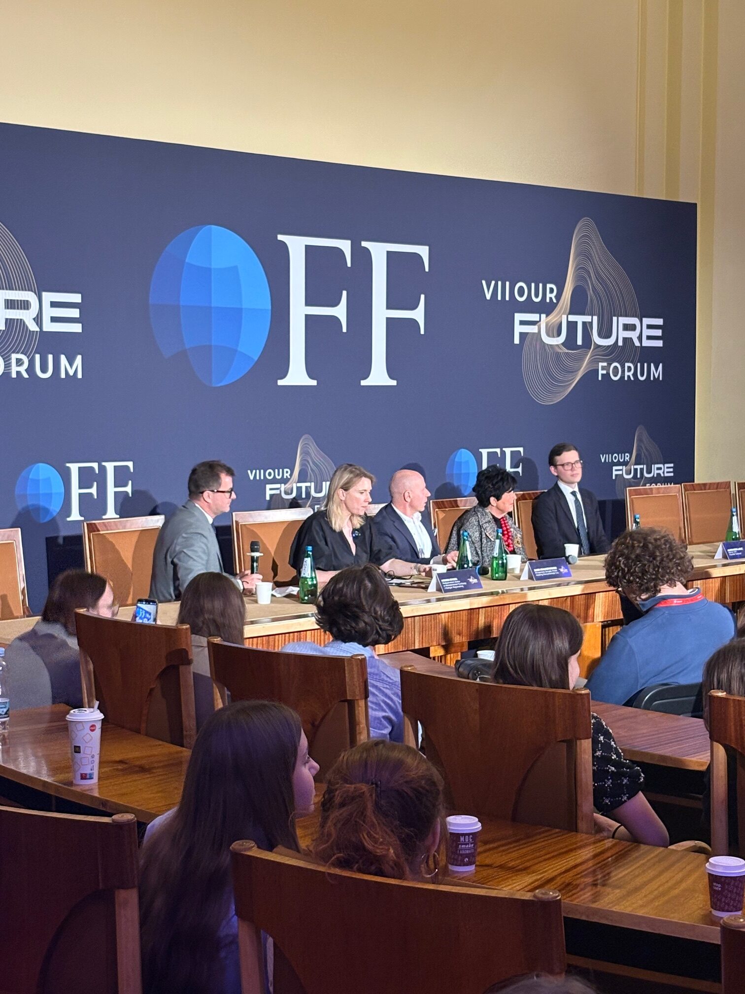 W środę 3 grudnia grupa 60 uczniów klas III i IV LO wzięła udział w największej konferencji edukacyjnej w Polsce – Our Future Forum, odbywającej się w Pałacu Kultury i Nauki w Warszawie. W ramach konferencji uczestniczyli w panelach dotyczących inwestowania pieniędzy, gospodarki Polski i Europy, zmian klimatu, rynku pracy, zdrowia, zmian w prawie, czy nowych rozwiązań technologicznych. Wysłuchali także rozmów 1:1 ze znanymi osobami ze świata szkolnictwa, biznesu i polityki. Równolegle odbywały się warsztaty z pierwszej pomocy, inwestowania oraz korzystania ze sztucznej inteligencji. Uczniowie mogli posłuchać, a przy odrobinie szczęścia, zamienić parę słów i zrobić sobie selfie z prelegentami, wśród których byli m.in. były wicepremier RP prof. Grzegorz W. Kołodko, wicemarszałek Sejmu Krzysztof Bosak, prof. dr hab. Joanna Senyszyn, Minister Sprawiedliwości Waldemar Żurek, Minister Cyfryzacji Krzysztof Gawkowski, Minister Zdrowia Jolanta Sobierańska-Grenda, Minister Rolnictwa i Rozwoju Wsi Stefan Krajewski, a także Prezydent RP w latach 1995–2005 Aleksander Kwaśniewski.