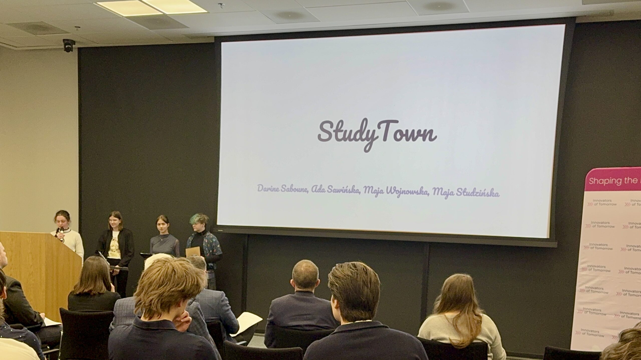 Templeton, aby zaprezentować swój projekt podczas uroczystego półfinału. Nasze uczennice stanęły na scenie i przedstawiły założenia „Study Town” w języku angielskim przed szeroką publicznością oraz profesjonalnym jury składającym się z ekspertów świata biznesu i technologii.